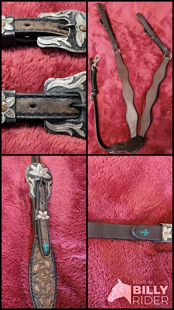 Unique WEAVER single ear snaffle plus breastplate - RARE size FULL - I offer a new beautiful Weaver Turquoise Cross Collection Set, consisting of a one-ear western snaffle and a matching breastplate! The bit is NOT part of the offer and will not be sold. This set is no longer for sale!!!! It has been hanging on the wall in my living room as decoration (so always tempered and dry) and waiting to be used and now....... .... it doesn't fit my new saddle - howl! What a shame, because such a great western snaffle plus matching breastplate is hard to find and an absolute eye-catcher! I really hate to part with them and the new owner will love both!