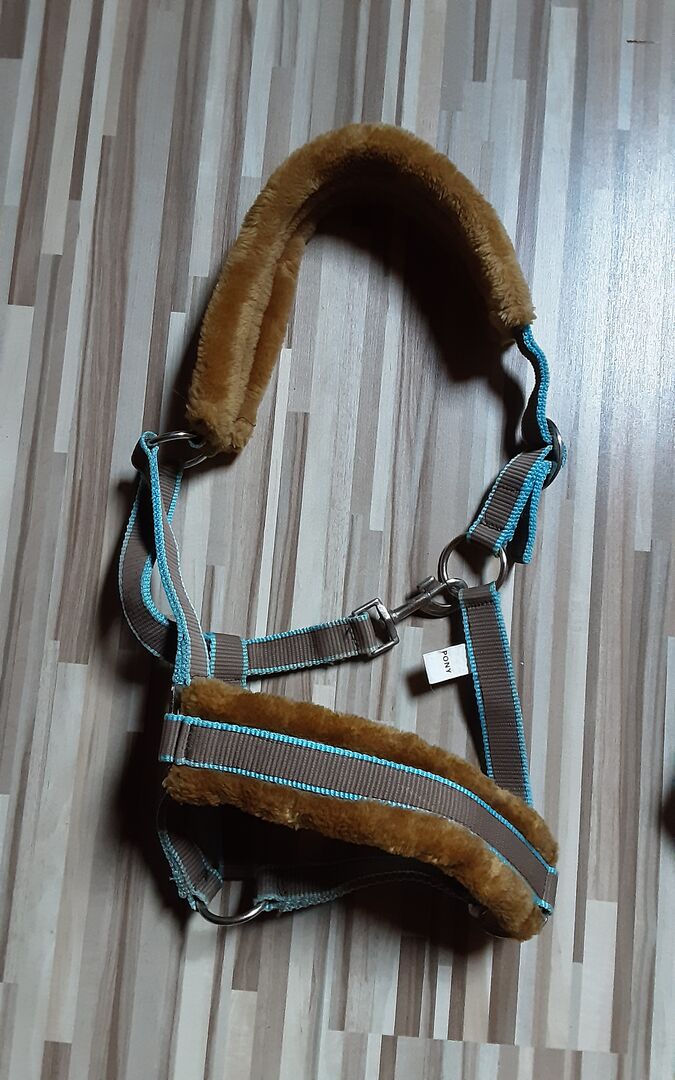 Various halters - Offer here various halters in different sizes: - Black leather halter with white lining in size warmblood with red-black cord, 10,- € - Eskadron Heritage in grey-pink with rosé fittings in size warmblood, 20,- € - knotted halter in size warmblood, 8,- € - red-blue halter size pony, halter in blue-navy size pony, black-beige halter size cob, halter blackberry-brown size thoroughbred, halter blue-peach size pony, each 5 ,- € - Halter from Pfiff in brown-light blue with teddy fur underlay, size pony, 10 ,- € - Halter from Horze, Platinum Crescendo, in light blue with white teddy fur underlay, size warmblood, 10,- € each
