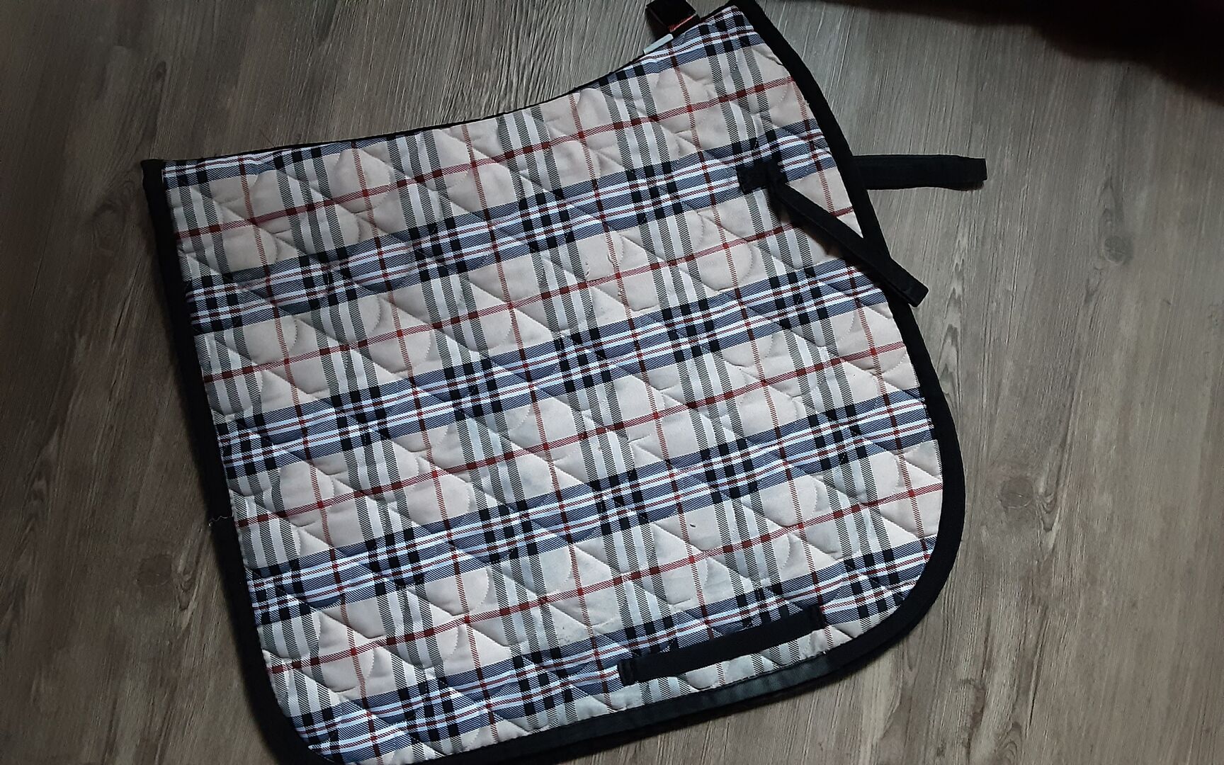 - Red VS saddle pad by Showmaster, good condition, 8,- € - Dressage saddle pad in brown with orange border, dressage, €5 - Brown dressage saddle pad by Felix Bühler, 8,- € - Blue/ beige checked dressage saddle pad, €5 - Brown plaid dressage saddle pad, 5,- €