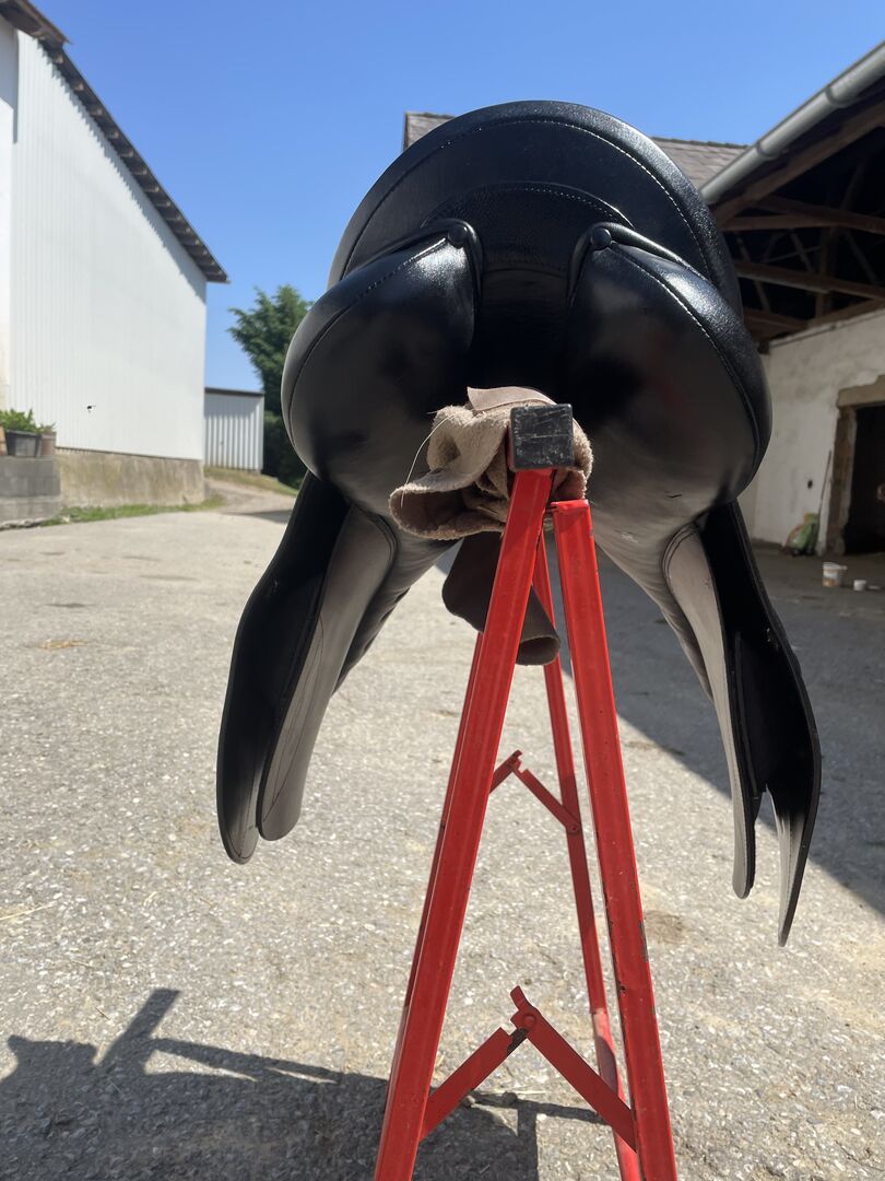 Has been on my halfblood. The 17.5" seat is very comfortable to sit on, even after long rides. Wide spine channel, soft pads. Velcro thimbles under the saddle to attach individually. Safety suspension of the stirrup leathers. Girth straps fully in tact, nothing worn out. Has always been stored dry and with saddle guard, cleaned regularly, always taken good care of it. Chamber width 34, is still customizable by the saddler!