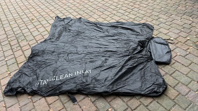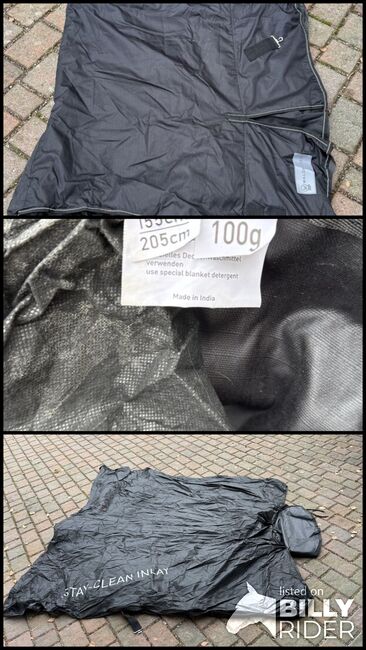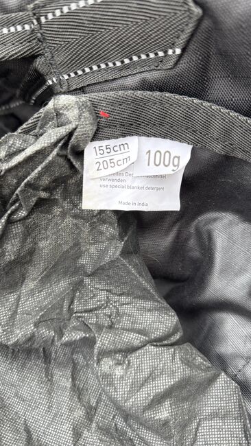 Waldhausen NORDIC outdoor rug 155cm, high neck, 100g - I am selling my unworn high neck outdoor rug from Waldhausen. The Stay Clean inlay is still present and is for short-term use when trying on. Data on the rug: - Filling: 100 g - Outer material: 600 denier ripstop - Breathable and waterproof (3000 mm) - Double T-front closure - Higher cut neck (high neck) to prevent chafing - Pleat for freedom of movement - Stay Clean Inlay for hygienic fitting - Clip-in cover system compatible - Cross surcingles and tail flap - Reflective details