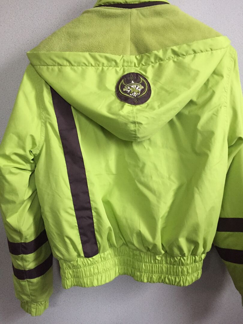 Warm Kentucky jacket in GrS - Warm teddy fleece lined jacket in size S with hood.in striking green with brown contrast applications. Zipper, cuffs, left side. Emblem on the right chest. Elastic cuffs sleeves, waistband