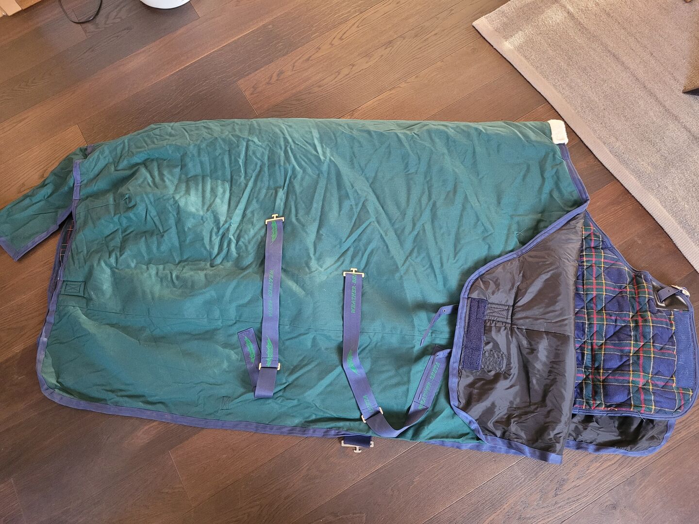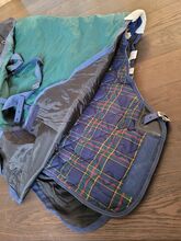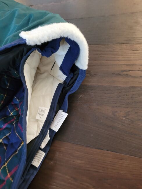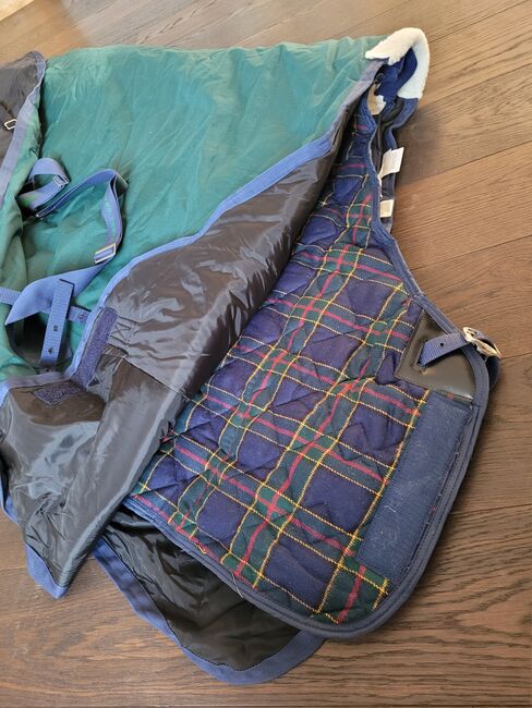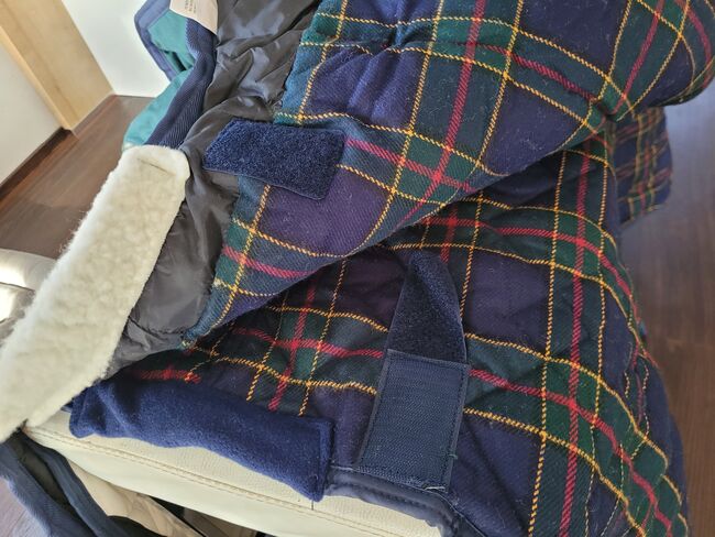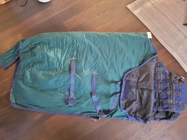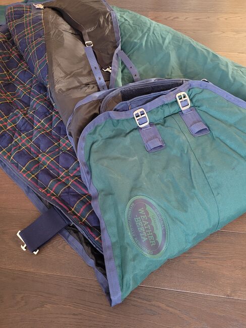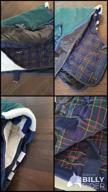 WeatherBeeta 2 horse rugs winter rug incl. sweat rug - Original Weather-Beeta horse rug set in the color green/navy The rug consists of a warm, waterproof winter rug and a lined sweat rug. The rugs were purchased as a set, unfortunately my mare passed away and the rug was never used. Length: Back length 160 cm - total from the chest to the end of the tail flap 200 cm (my mare was 1.71 cm tall) Width per side approx. 100 cm (withers down to the leg) The rug is made of waterproof and windproof material. It is also lined with padding and has a soft wither pad for a high level of comfort. The rug has elastic, adjustable and removable leg straps that ensure a secure fit. There are also 2 adjustable belly straps on the belly and a loose tail guard at the back. For a perfect fit in combination, it also has various Velcro fasteners, similar to the under rug.