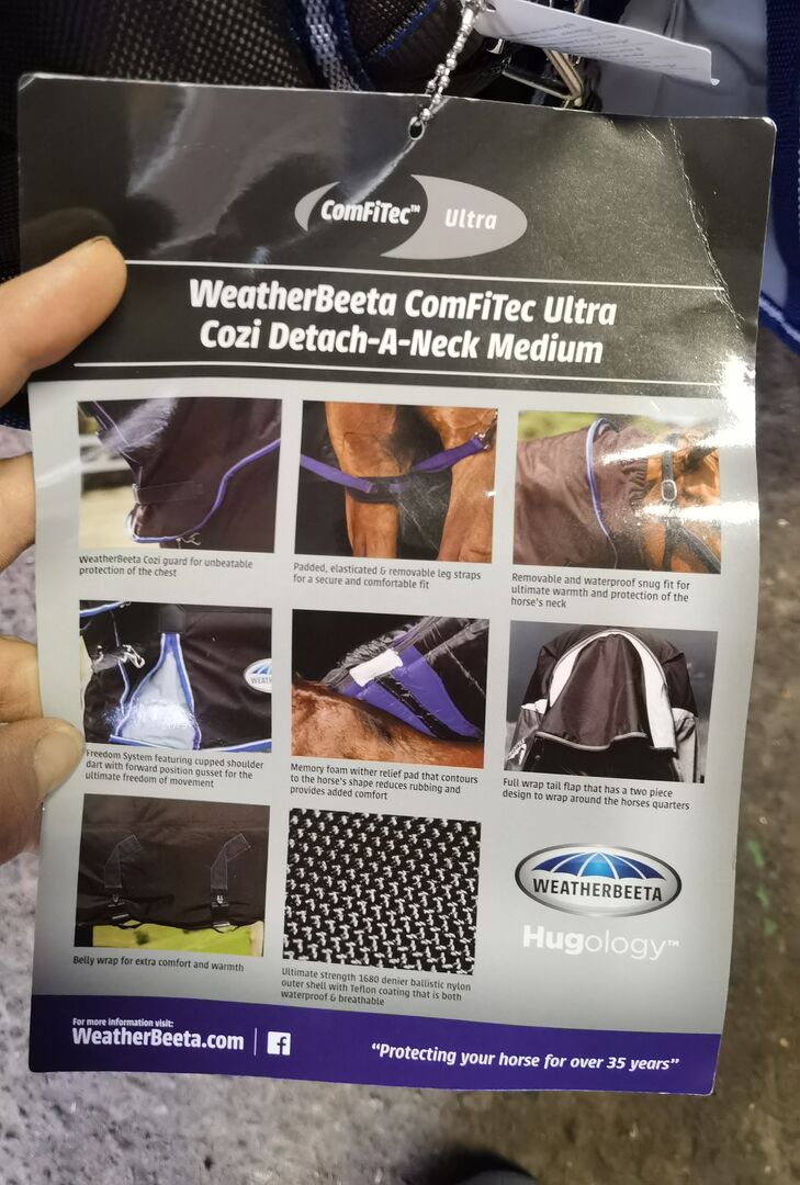 Weatherbeeta comfitec ultra cozy winter blanket 145cm - Brand new winter rug from Weatherbeeta with detachable neck part and fleece part extra, padded leg cords, size 145cm. Weatherbeeta comfitec ultra cozy detach a neck medium Was never on the horse, new price 370€