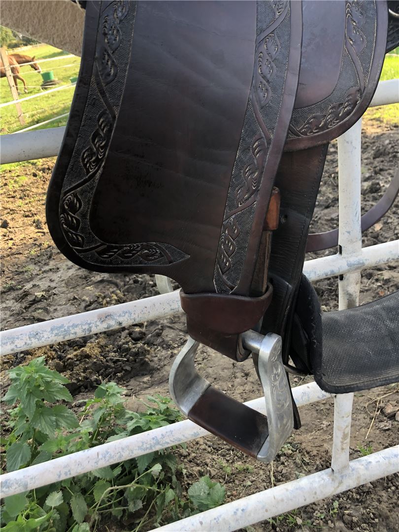 western saddle - Sell here my used Continental Western saddle. The saddle is used and shows the usual signs of use. The Choncha distance is about 23 cm and the length is 62 cm the seat is 16". The saddle has little pep. Tie Strap and Off-Billet are available. The stirrups are made of metal. Since the date has a synthetic saddle tree it is quite light.