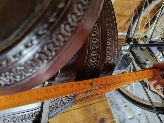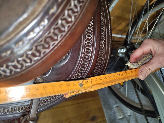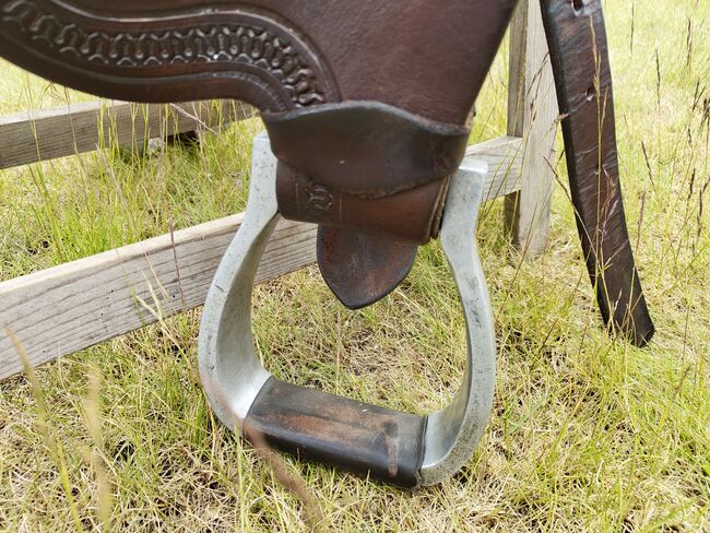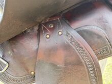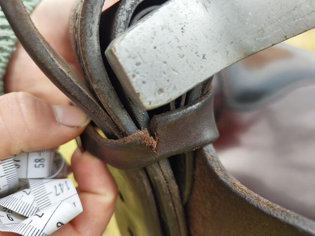 The small strap on the stirrup is slightly torn, see photo. But does not affect the use of the saddle.