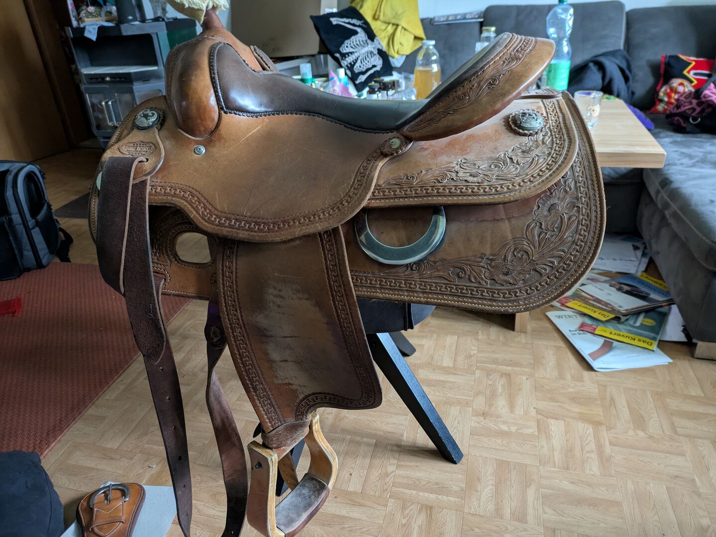 Western saddle Equinedesigns - Western saddle from Equinedesigns for sale at a reasonable price due to signs of wear. - Fender rubbed on both sides by boots (only slightly visible when riding) - 2 conchos missing, these can be replaced. - Small scratches I would be happy to take more photos or measure something else