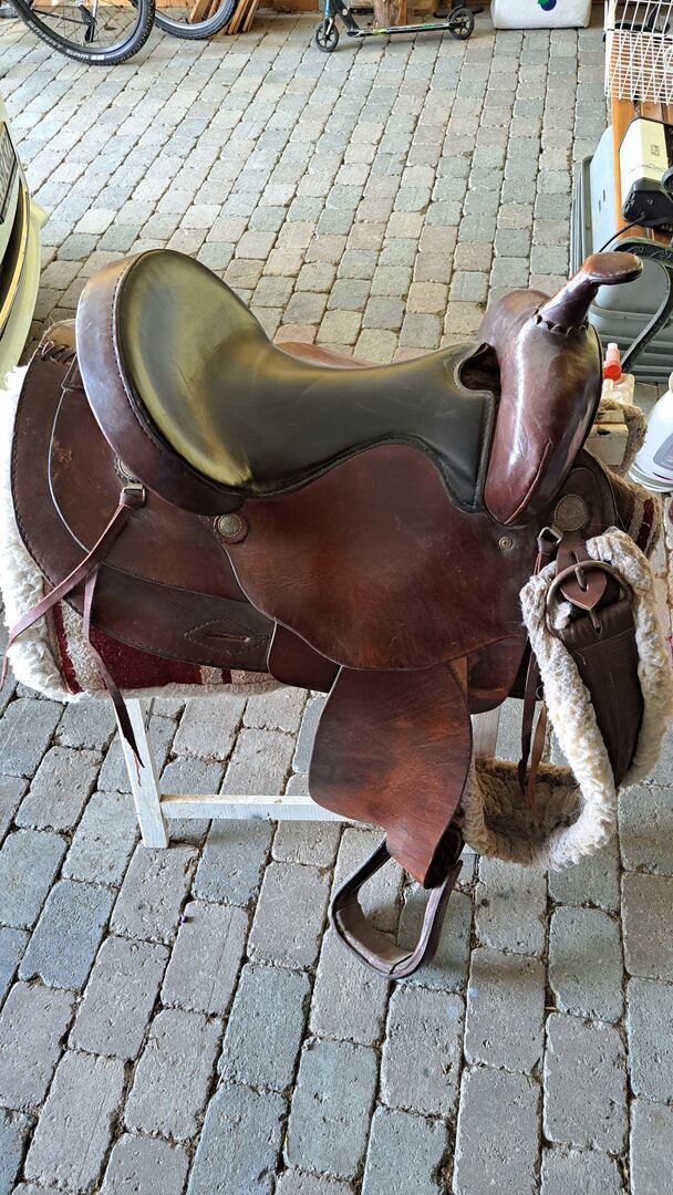Simco - Older good condition western saddle brand Simco with 3cm lambskin pad and lambskin girths.