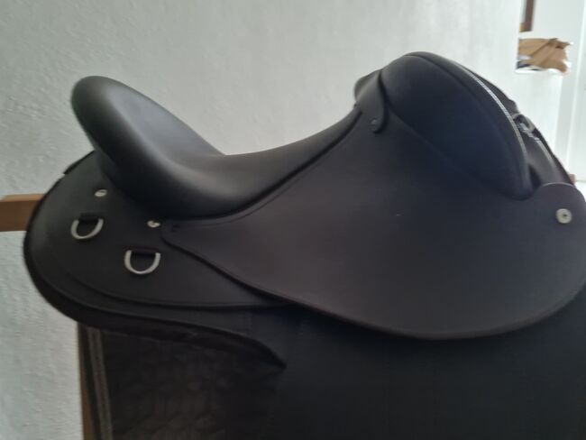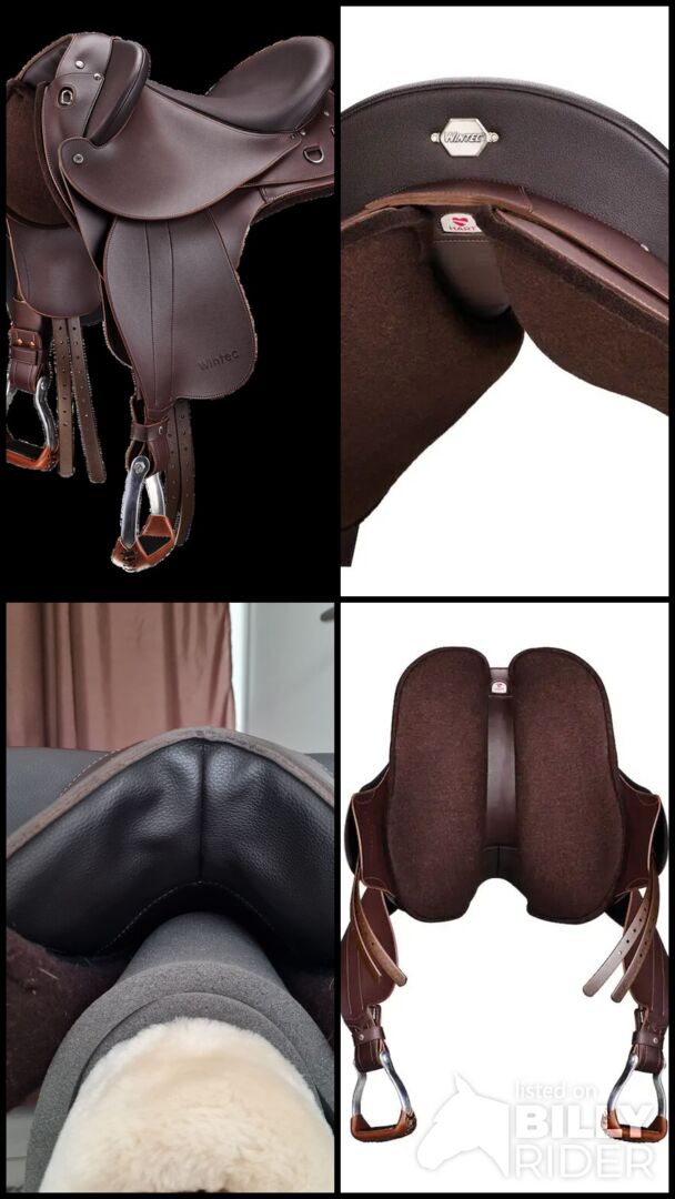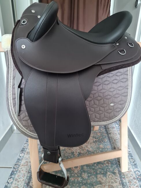 Western saddle / stock saddle / working equitation / trail riding saddle - Wintec Half Breed saddle, hybrid of western and stock saddle, also called polo cross saddle, extremely comfortable for rider and horse, individually adjustable in width and swing directly on site by means of exchangeable gullet plates (from narrow to extra wide) and inserts for appropriate padding. It sits wonderfully close to the horse and is therefore suitable for gymnastics or working equitation disciplines as well as for relaxed cross-country riding and especially for insecure riders who prefer safety and good support in the saddle. This saddle was imported directly from Australia in 2025, is currently not yet available in Germany, is only being sold because it unfortunately does not fit my riding barrel. Seat size M (corresponds to 16" western saddle seat or 17" dressage saddle), normal standard fender length. Suitable for narrow to strong horses, not for over-wide horses with very round backs. Excellent for short horses. Currently fitted with white (wide) gullet plate, but can be replaced if required. No damage, has not been on the horse 5 times, light and almost indestructible saddle tree if used properly. Total length: 58cm. Excellent quality and workmanship and much lighter than a normal western saddle. Fitting and adjustment on site of course possible. For immediate purchase 1300€. Please refrain from requests for payment by check.