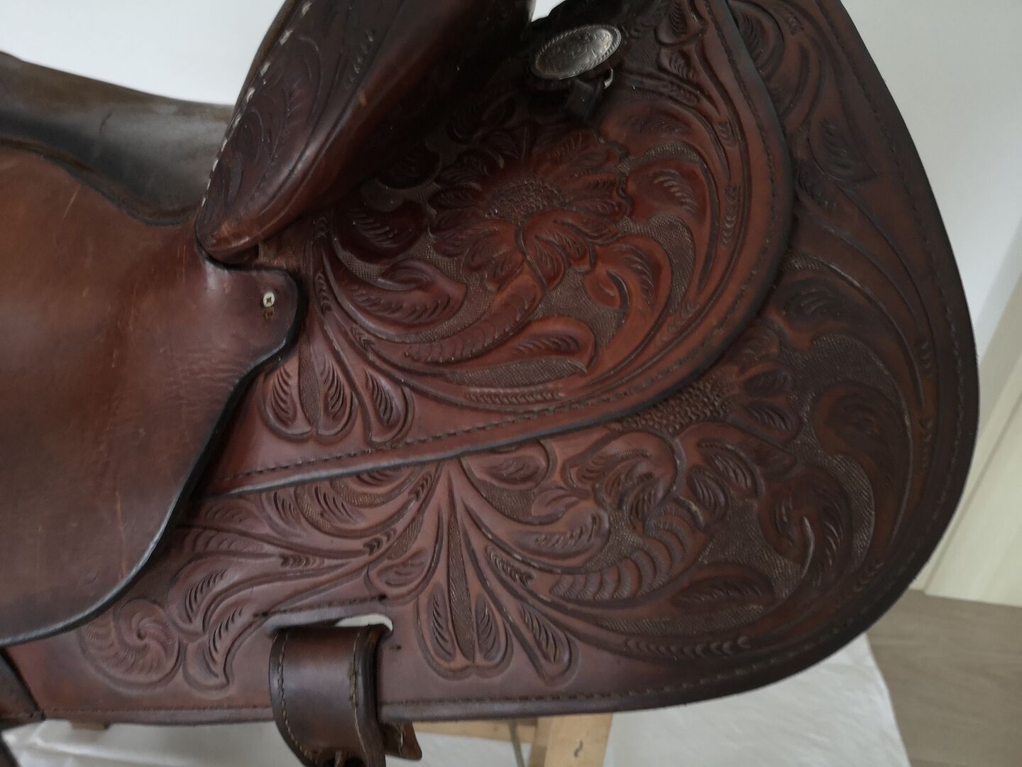 Selling my beautiful western saddle in red-brown. The western saddle is super comfortable and has beautiful hallmarking in a floral pattern. Conchos to match the hallmarking.