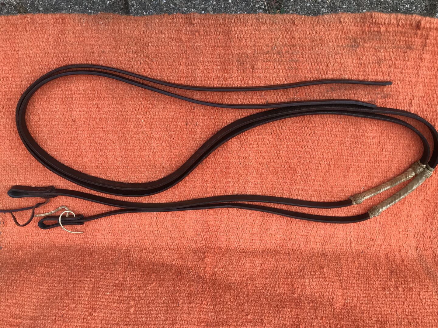 Western show snaffle dark brown - Offer here a beautiful show snaffle with braided rawhide layers in a nice contrasting color. Included are 2.70m Lande Split Reins also with incorporated rawhide. The condition is very good. The snaffle has only been used a few times at shows. The leather is thick and very high quality. The bridle sits very well on the horse's head. There is the option of attaching tassels to the front of the browband.