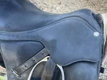 The saddle is fully intact and is being sold because it is too big for my horse. The only defect I know of is the missing label on the stirrup flap on the left, but this is not functionally relevant.