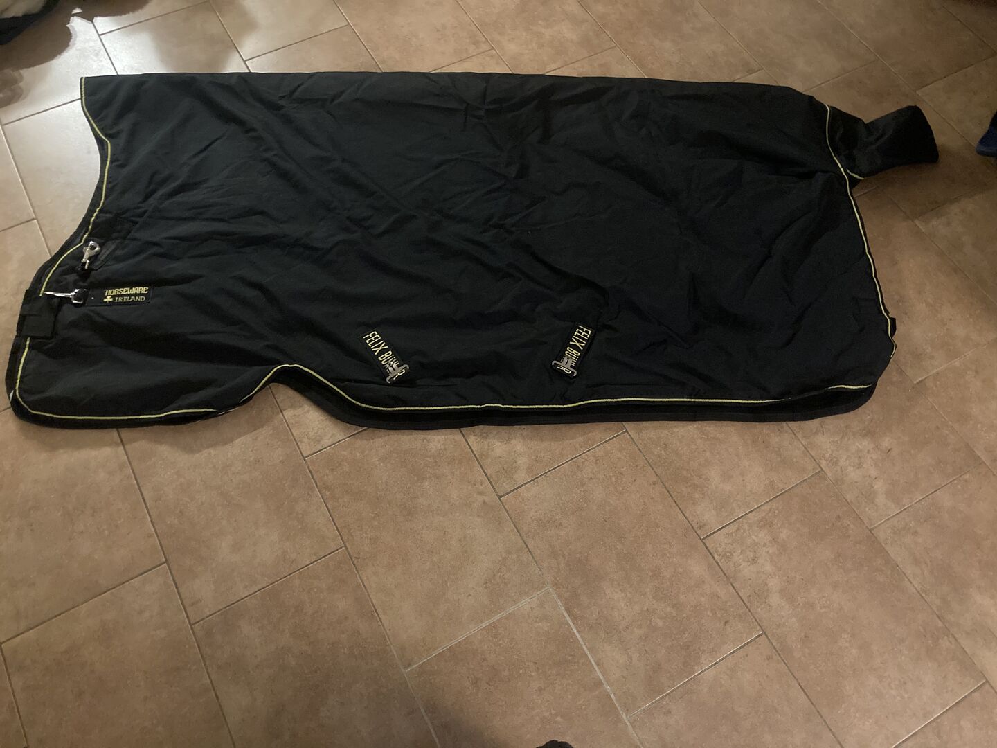 Winter blanket HORSEWARE Ireland 250g black Felix Bühler - Waterproof and breathable winter blanket with highneck and warming 200 g padding (600 denier). Inside the blanket has a smooth polyester lining. This prevents chafing and hair breakage and keeps the coat smooth and shiny. The front closure as well as the front leg neckline ensure optimal freedom of movement and super fit. - Size 145 cm - Breathable - Wind and waterproof - Robust denier material - Adjustable cross surcingles - Tail bib Much too warm for my little one. Blanket worn three four times, like new. Freshly washed and impregnated at the dry cleaners