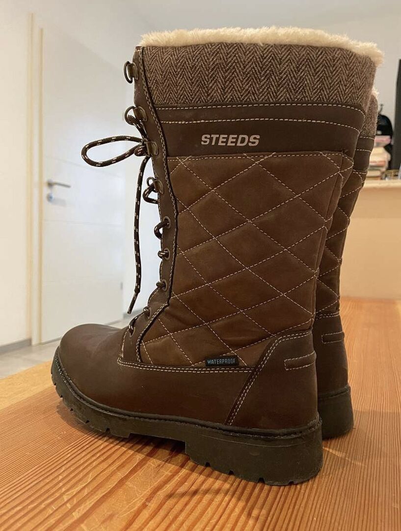 Winter stable boots - Waterproof winter stable boot with full-length lacing. Lined inside with very soft teddy fleece (100% polyester), which keeps feet toasty warm. The incorporated waterproof membrane as well as the laterally sewn shoe tongue prevent snow or water from penetrating. Elegant look thanks to textile insert at the end of the shaft and eye-catching contrast stitching. The quick lacing allows you to quickly put on and take off. Grippy tread sole for best grip even on icy surfaces. Upper: Polyurethane.